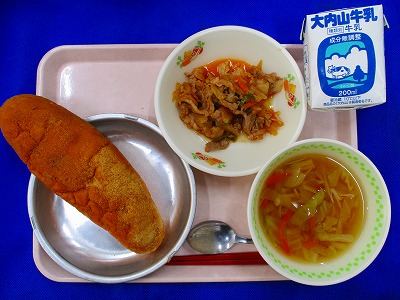 きな粉揚げパン・牛乳・豚肉と野菜のケチャップ炒め・キャベツとじゃがいものスープ