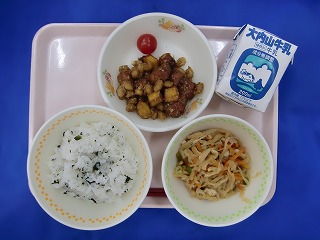 わかめごはん・牛乳・かつおと大豆の揚げ煮・ミニトマト・切り干し大根の煮物