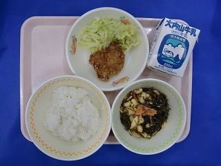 むぎごはん・牛乳・さめのから揚げ・添え野菜・大豆と昆布の炒め煮