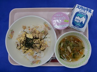 チキンピラフ・牛乳・もずく入りたまごスープ・フルーツポンチ