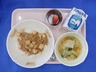 マーボー飯・牛乳・ワンタンスープ・いちご