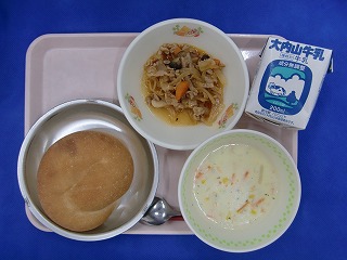 米粉入りまるがたパン・牛乳・豚肉と野菜のケチャップ炒め・クリームスープ