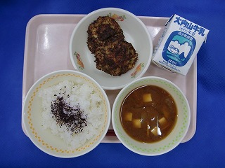 むぎごはん・牛乳・てづくりふりかけ・親子煮・ひたし