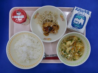 むぎごはん・牛乳・とりのねぎソースかけ・もやしのひたし・お祝いかきたま汁・ヨーグルト