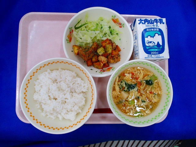 むぎごはん・牛乳・しいらとさつまいものあおのりあげ・そえやさい・かきたまじる