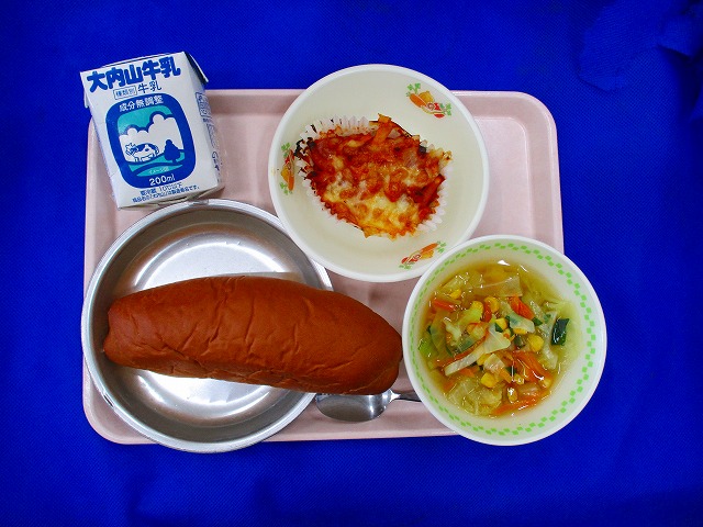 こくとうぱん・牛乳・チキントマトグラタン・キャベツスープ