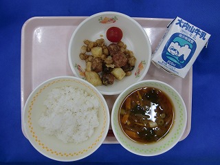 むぎごはん・牛乳・かつおと大豆といもの揚げ煮・ミニトマト・みそ汁
