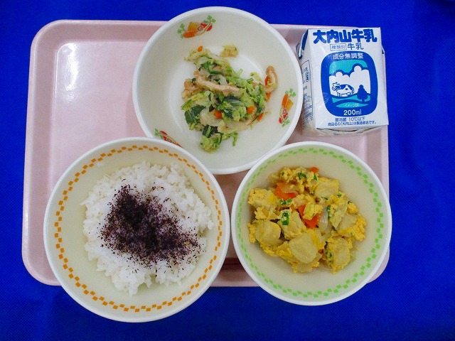 むぎごはん・牛乳・しそふりかけ・こうやどうふのたまごとじ・ごまあえ
