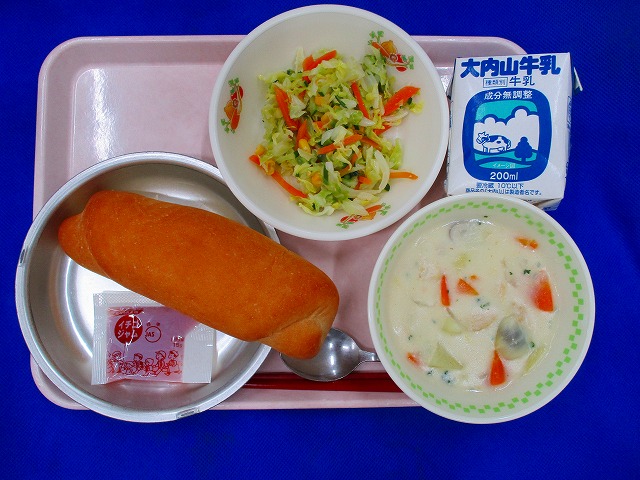コッペパン・牛乳・いちごジャム・クリームシチュー・フレンチサラダ