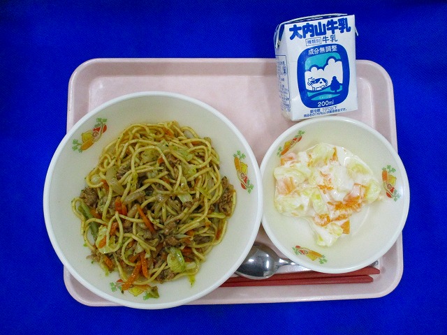 やきそば・牛乳・フルーツのヨーグルトあえ