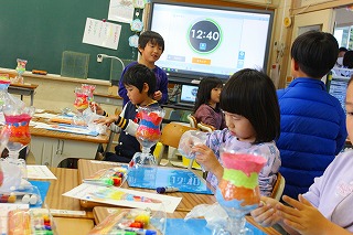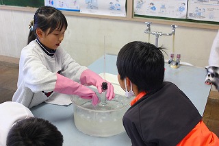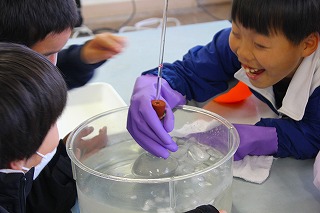 今日は「水を温めた理、冷やしたりすると体積は変化するか?」という実験です。班で協力しながら実験を進めていました。