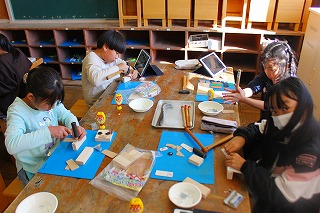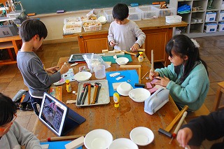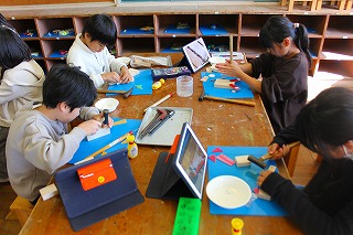 3年生が図工で立体作品を作っていました。木切れにくぎを打って、動物を作っているようです。