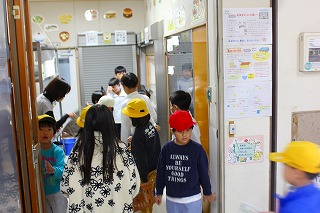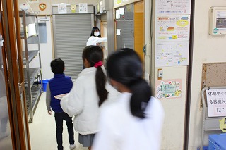 食べ終わった後は、給食室まで食缶や食器を返却に子どもたちがやってきます。食缶や食器を棚に返す時子どもたちは「ありがとうございます。おいしかったです」と大きな声で感謝の気持ちを調理師さんに伝えています。