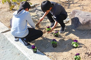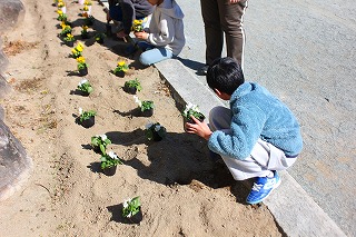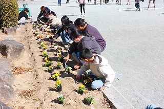 保健体育委員会の5,6年生が花壇にパンジーとビオラを植えました。卒業式に向けて学校の花壇が華やいでいます。