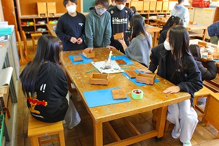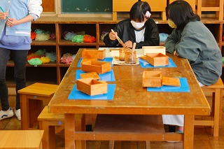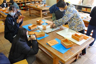 6年生の卒業制作も佳境に入っています。オルゴールボックスも彫る作業は終わり、色のついたニスを塗り仕上げの作業に入っています。