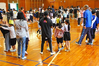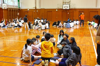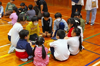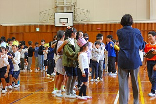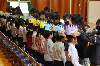 その後1年生を迎える会があり、6年生から1年生へプレゼントが送られました。じゃんけん列車で全校で楽しみました。