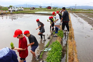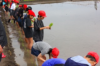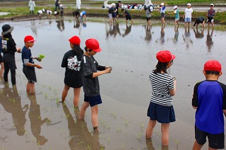 北浜小学校近くの田んぼをお借りして、手で苗を植える体験をしました。はだしやくつしたで泥の中へ入って、苗をていねいに植えていきました。