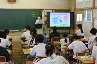 今日は6年生の保険の授業として、学校薬剤師の先生に来ていただき「薬の正しい使い方」について授業をしていただきました。
