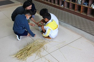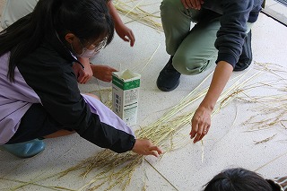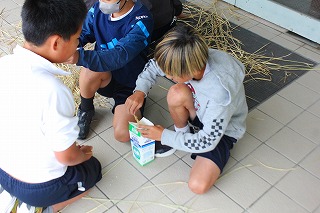 牛乳パックを使って、しっかりと乾燥させた稲穂から一粒ずつモミを取り外していました。