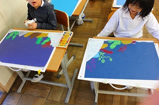 来月の進修ミュージアムに向けて各学級ではいろいろな作品作りに取り組んでいます。1年生は海の底の様子を描き始めています。