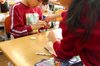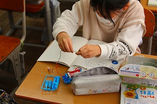 3年生は理科の時間に「電気を通すものと通さないもの」について調べました。実験道具を組み立てるときには、協力しながら組み立てていました。
