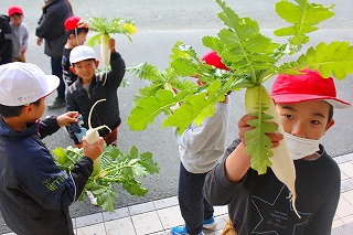 2年生が種から育てた大根を収穫しました。しっかりと育った葉っぱをつけた大根です。長い大根や太い大根などいろいろな大根が取れました。