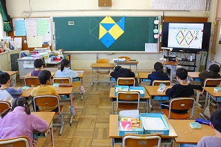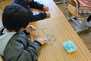 1年生は算数の学習で、数え棒を使って図形を作ることに挑戦です。三角形を組み合わせた図形を見ながら、自分たちでも、数え棒を並べていました。