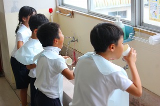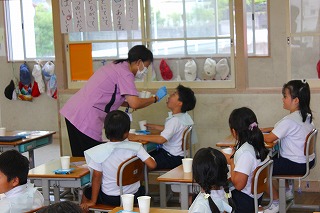今日は2年生と5年生が学校歯科医の金剛先生と、歯科衛生士の方に歯みがきについての授業を行っていただきました。