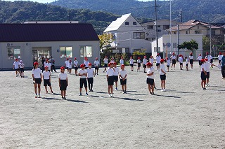 低学年も表現運動の練習を始めました。3学年集まって、動きを確認しながら練習していました。少し難しいステップもあるようです。