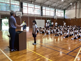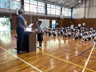5限目に後期児童会役員・学級委員・委員長の認証式と、科学創作展の表彰伝達を行いました。