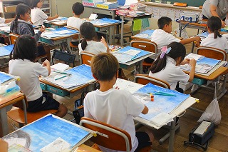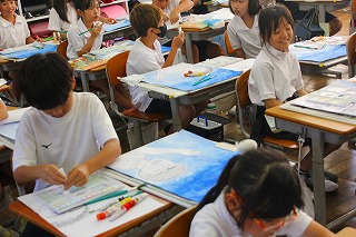 3年生の絵画がだんだんと仕上がってきました。大きなヒマワリを見上げる子どもたちの絵です。