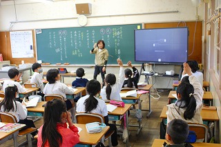 3年生が総合の時間に調べた、おはらい町のお店についてまとめたことを、2年生に向けて発表しました。