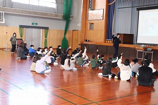 内容は、まず、コナンの出てくるクイズ形式のDVDでいくつかの場面について考え、次に児童の代表者が実際に逃げ方を体験するという構成でした。