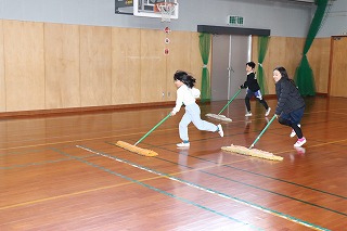 息を合わせてモップをかけるのは、なかなか難しいようです。バラバラ・ジグザグですが、それぞれが楽しそうにモップをもって体育館を走り回っていました。お掃除、ごくろうさまでした。