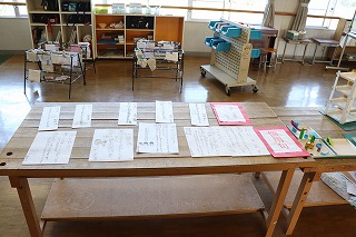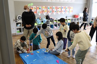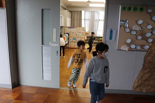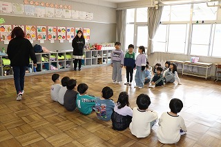 2限目・3限目に佐八保育園きりん組さんが来校し、1年生と交流会を行いました。交流会では、始まりのあいさつ、校舎案内、遊び屋さん、プレゼント贈呈、演奏のプレゼント、終わりの挨拶をしました。あいさつや校舎案内では、一人一人が担当を受け持ち、その担当の説明をしました。みんなうまく説明できていました。遊び屋さんも人気で、一緒に楽しみました。