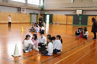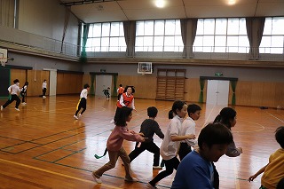 児童会の話から始まり、4・5年生の各担当が内容を説明し、ドッジボール、しっぽ取り、学校かくれんぼ、イントロクイズを楽しみました。