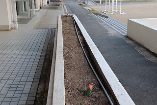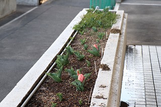 1.2年生が毎日水やりをして、チューリップを育てていました。春休みになり、子どもたちの水やりはなくなりましたが、チューリップがいくつか花を咲かせています。