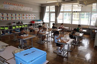 もう1枚の画像は1年生の本日の給食風景です。みんなおいしそうに頂いていました。