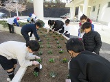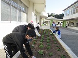 「伊勢市女性団体連絡協議会」の方々のご指導のもと、美化委員会がビオラとクリサンセマム・スノーランドの苗を植えました。事前に協議会の皆さんが丁寧に穴を掘り、苗を置いてくださったおかげで、スムーズに作業を進めることができました。前期は猛暑が続きましたが、業務員さんの協力もあり、花を枯らすことなく大切に世話をしてきました。この時期は、気候も安定し、美化委員会の日々の水やりのおかげで、苗は大きく育ってくれることでしょう。きっと今年度の卒業式と来年度の入学式には、華やかな彩りを添えてくれるはずです。