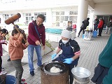 子どもたちは杵と臼を使ったもちつきを体験し、つきたてのお餅から作っていただいたあんこ餅やきな粉餅、ぜんざいを、保護者や地域の方々と一緒に美味しくいただきました。