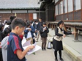 旅館を出発し、最初に二条城へ。多くの修学旅行生や海外からの観光客が訪れる中、鴬張りの音に感動しながら、美しい障子画の広間を見学。鴬張りの仕組みを後で確認することもできました。