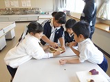 5年生は、バケツで育てた稲から収穫した稲籾(いなもみ)を使い、昔ながらの籾摺り(もみすり)作業に挑戦しました。手作業で道具を使って籾(もみ)と玄米を分ける作業は思った以上に大変な力仕事だったようです。「これは大変だ!」「昔の人はすごい!」といった声が飛び交い、米作りの大変さを身をもって感じることができました。この後、さらに精米作業も行う予定です。自分たちで育て、苦労して精米したお米を食べるのが楽しみですね!