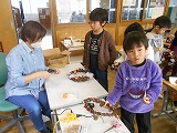 1年生は、秋に学級園で収穫したサツマイモのツルを乾燥させて、クリスマスリース作りをしました。今回は、いよいよ仕上げの段階です!事前に準備した松ぼっくりや、自分たちで工夫して作った飾りを、ボランティアの先生に手伝ってもらいながら、グルーガンでツルにしっかりと固定していきました。みんな真剣な表情で飾り付けを行い、素敵なオリジナルリースが完成しました!持ち帰る日を心待ちにしているようです。