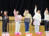 4年生は「感謝のカラーブック」。曲「正解」に合わせて本をめくり「ア・リ・ガ・ト・ウ」の文字を浮かび上がらせました。家庭での練習の成果が光る、息の合った発表でした。