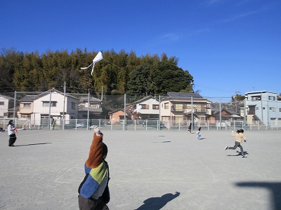 あいにくの微風でしたが、子どもたちは元気いっぱい!友達と協力して、グラウンドを一生懸命に駆け回りました。後半、待望の風が吹き始めると、凧は空高くぐんぐん上昇。糸が絡まるなどのトラブルもなく、冬の空に色とりどりの凧が舞いました。