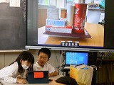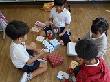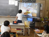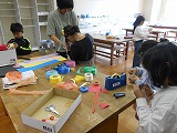 1年生が算数で、空き箱を使っていろいろな形の学習をしています。身の回りの箱を観察し、積み重ねたり、形を写したりして、遊びながら数の認識や形の仲間分けを学ぶ学習です。まず、ペアでいろいろな形の箱を使って、何を作ったか、どこを工夫したかなどを発表しました。そして、次に、グループで協力しながら何を作るか話し合っていました。