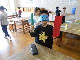 2年生が図工の時間に、画用紙の切れ端などを利用しながら、わっかの作り方を活かして変身グッズを作っていました。いろいろなアイテムも作って、みんな楽しそうに変身していました。