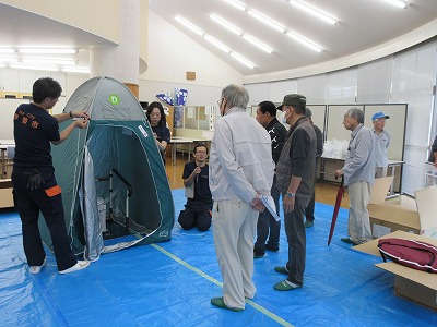 早修学区の各自治会の方々に集まっていただき、早修ふるさとNAVI「マンホールトイレの組み立て・使用法の実地訓練」が行われました。 小雨が降る中での訓練となったため、設置された男性用・女性用のトイレを見学した後、フレンドルームにて、伊勢市危機管理課担当者からマンホールトイレの組み立て方等の説明を聞き、実際に組み立てや片付けを行いました。その後、外に出て、マンホールトイレの使用手順(マンホールトイレ内への注水方法や汚物を流すための仕切弁の開き方等)について説明を受け、実際にマンホールを開閉したり、給水ポンプを使って注水したりしました。