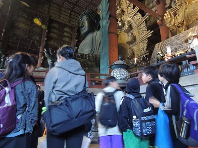 昼食を食べ、鹿せんべいをあげたのちに、東大寺へ。大仏の鼻の穴と同じ大きさの柱の穴を抜けることもでき、大仏の大きさを実感していました。