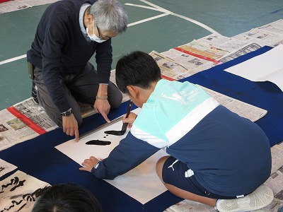 授業で行っている書写とは違い、大きな半紙に太い筆で、思い思いの一字を書きました。